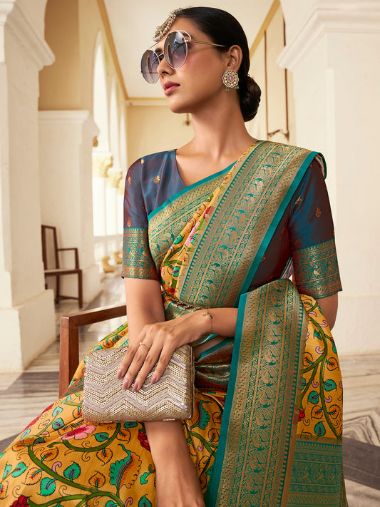 Women's Satin Silk Yellow Woven Design Designer Saree With Blouse Piece