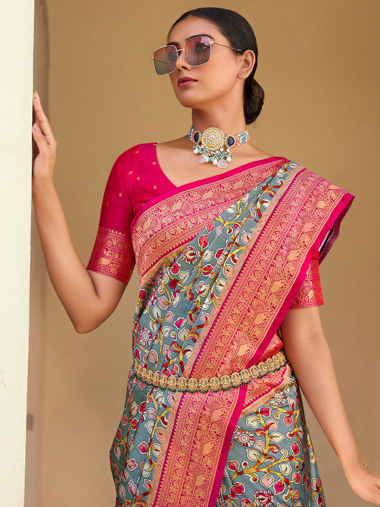 Women's Satin Silk Grey Woven Design Designer Saree With Blouse Piece
