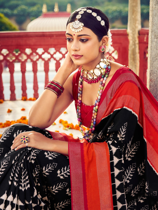 Women's Manipuri Silk Black Digital Print Designer Saree With Blouse Piece