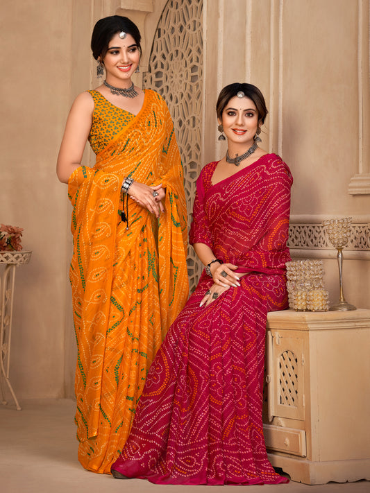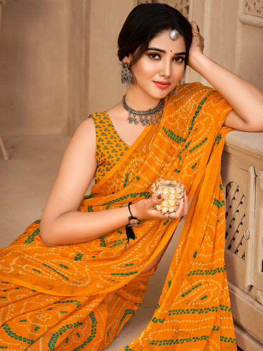 Women's Chiffon Yellow Printed Designer Saree With Blouse Piece