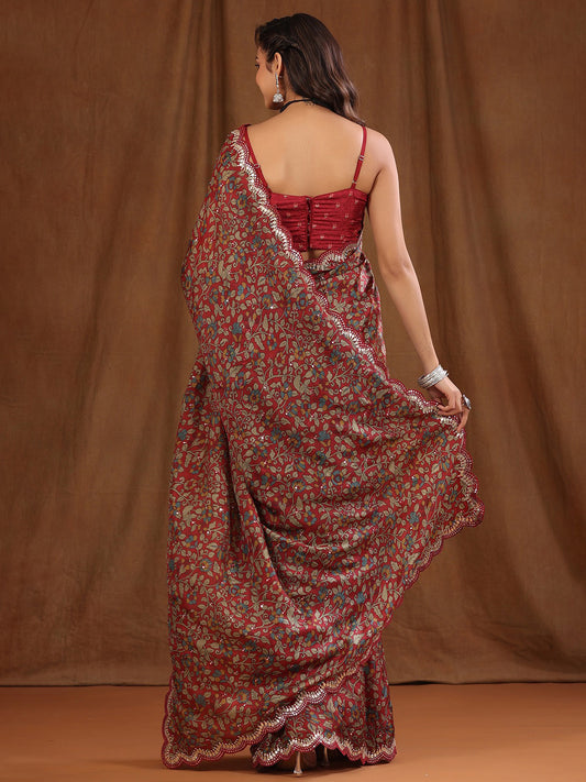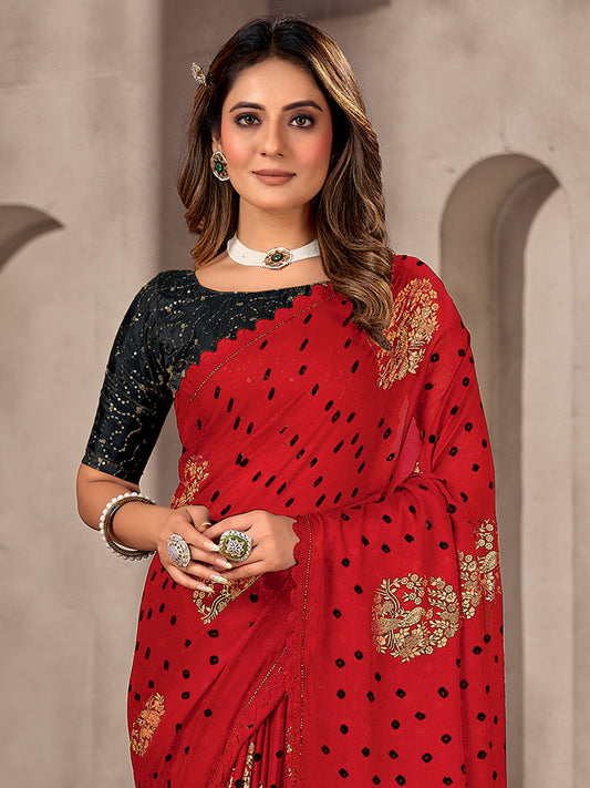 Women's Chiffon Red Embellished Celebrity Saree With Blouse Piece