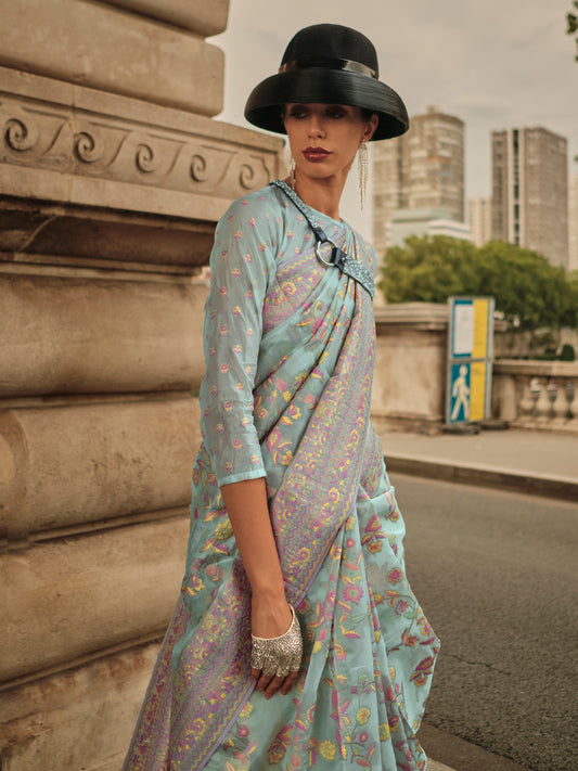 Women's Organza Light Blue Woven Design Designer Saree With Blouse Piece