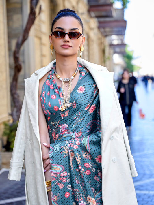 Women's Satin Silk Teal blue Digital Print Designer Saree With Blouse Piece