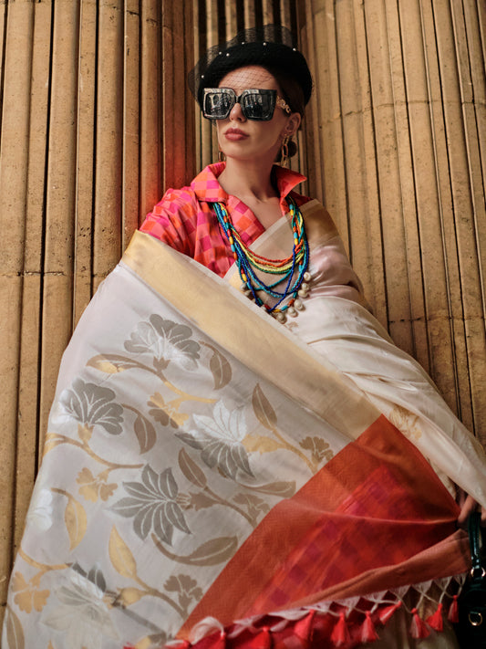 Women's Soft Silk Off White Woven Design Designer Saree With Blouse Piece