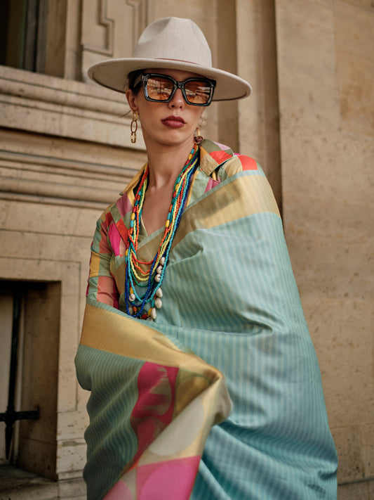 Women's Silk Blend Sea Green Woven Design Designer Saree With Blouse Piece