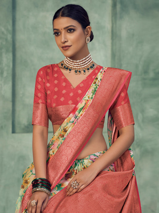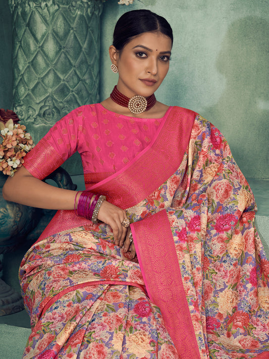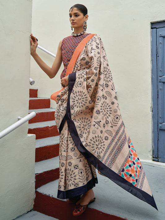 Women's Tussar Silk Cream Digital Print Celebrity Saree With Blouse Piece
