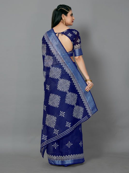 Women's Cotton Blend Navy Blue Printed Designer Saree With Blouse Piece