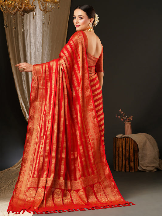 Women's Georgette Red Woven Design Celebrity Saree With Blouse Piece