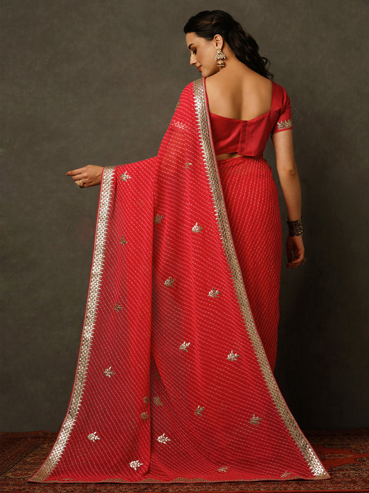 Women's Georgette Red Embellished Celebrity Saree With Blouse Piece