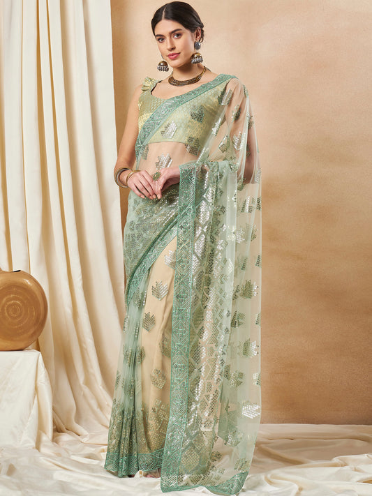 Women's Net Light Green Embellished Designer Saree With Blouse Piece