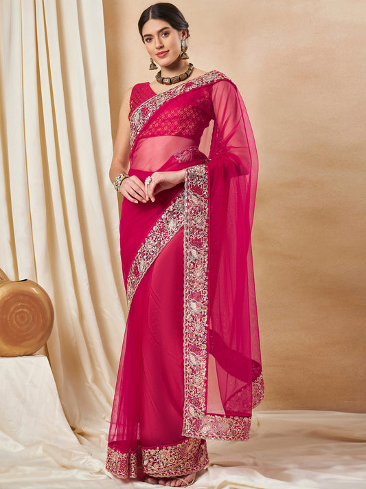 Women's Net Pink Embellished Designer Saree With Blouse Piece