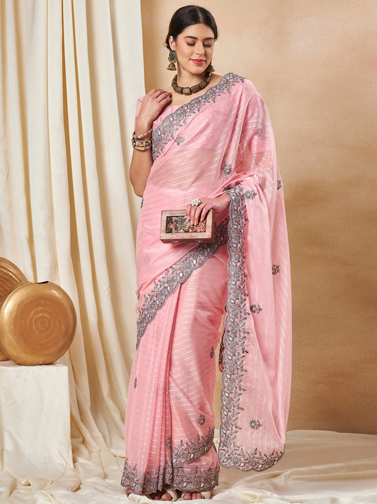 Women's Organza Pink Embellished Designer Saree With Blouse Piece