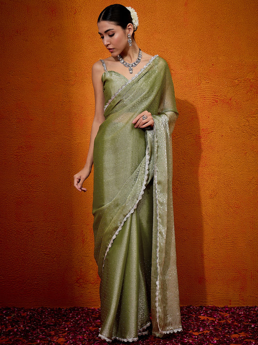 Women's Organza Olive Embellished Designer Saree With Blouse Piece