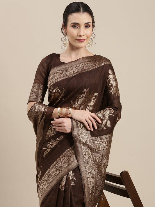 Women's Linen Brown Woven Design Woven saree With Blouse Piece