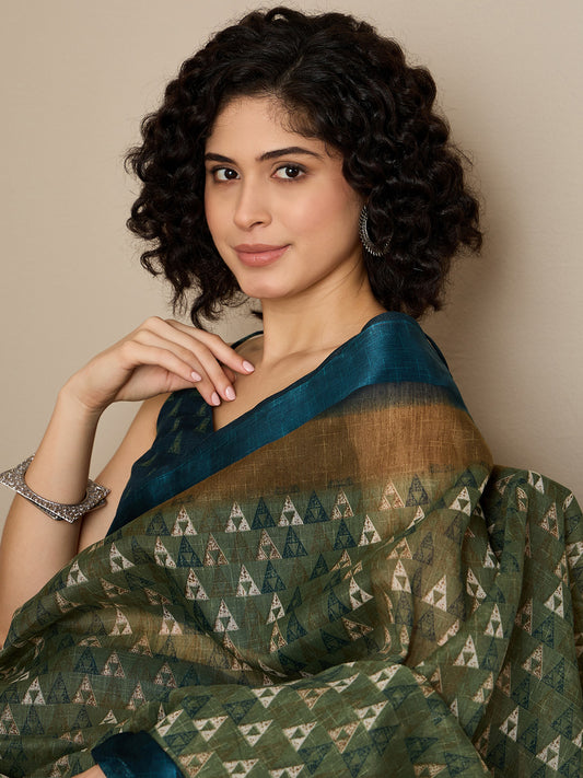 Women's Linen Olive Printed Ready to Wear With Blouse Piece