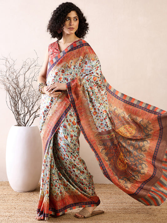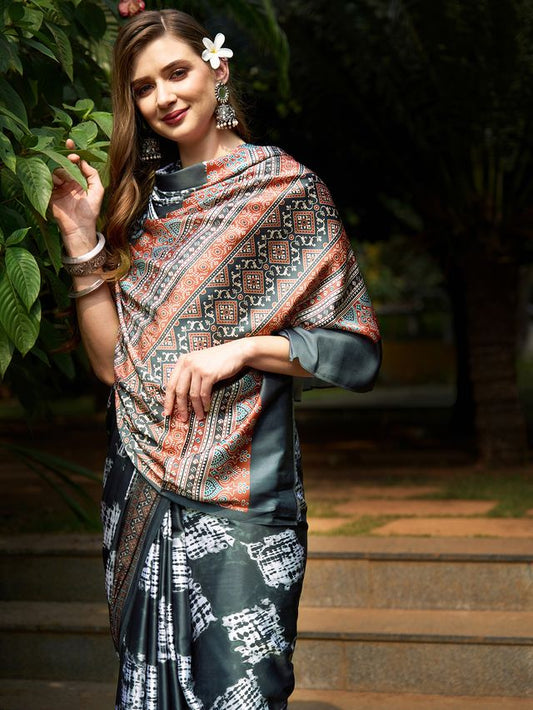 Women's Pure Crepe Grey Digital Print Designer Saree With Blouse Piece