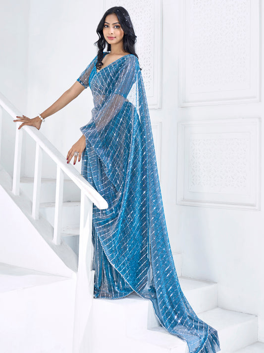 Women's Organza Blue Embellished Designer Saree With Blouse Piece