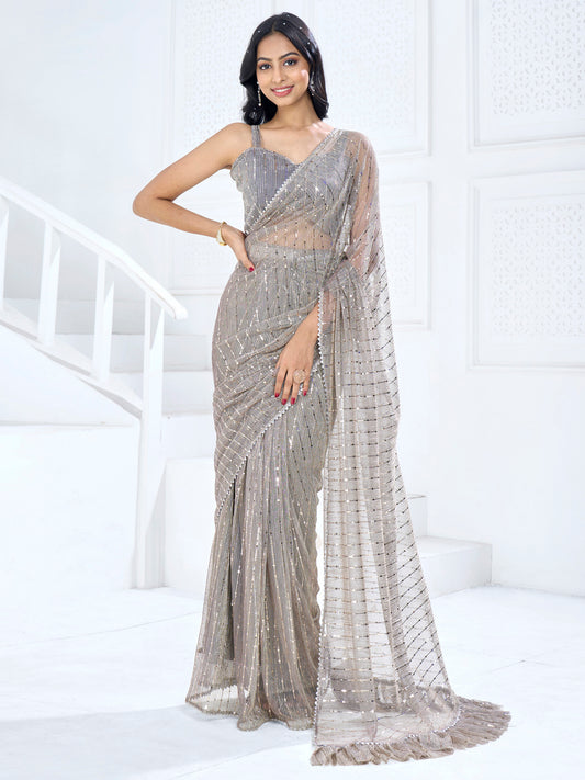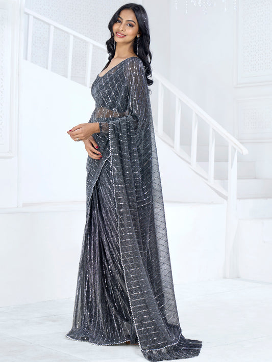 Women's Lycra Charcoal Grey Embellished Ready to Wear With Blouse Piece