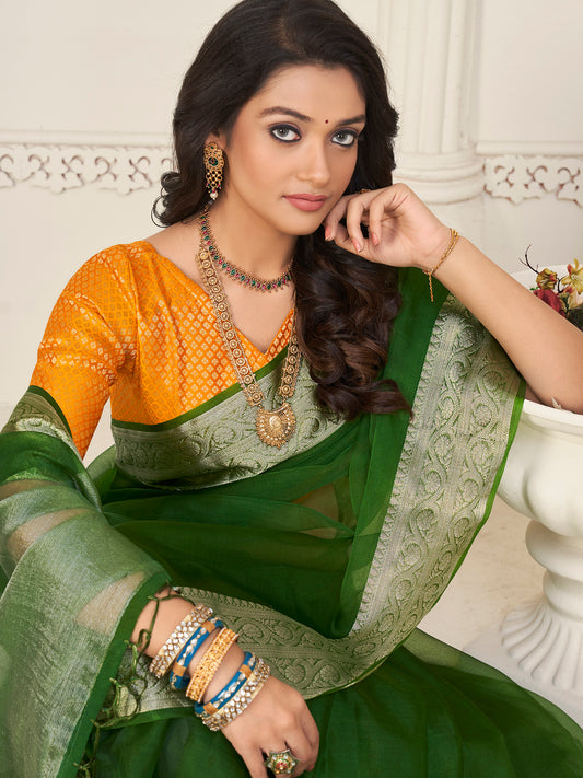 Women's Organza Green Woven Design Designer Saree With Blouse Piece