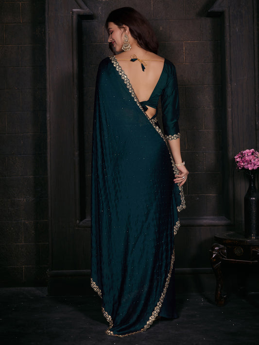 Women's Viscose Silk Teal blue Embellished Designer Saree With Blouse Piece