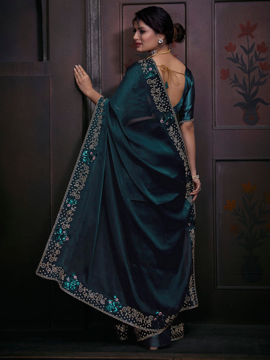 Women's Organza Teal blue Embellished Designer Saree With Blouse Piece