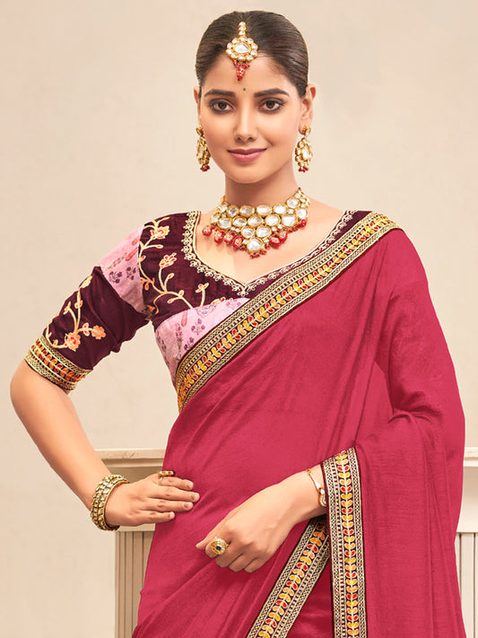Women's Vichitra Silk Pink Embellished Designer Saree With Blouse Piece