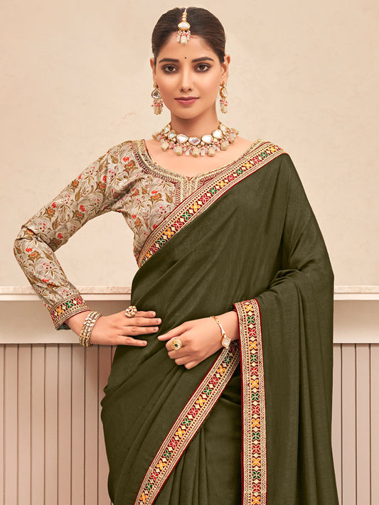 Women's Vichitra Silk Olive Embellished Designer Saree With Blouse Piece