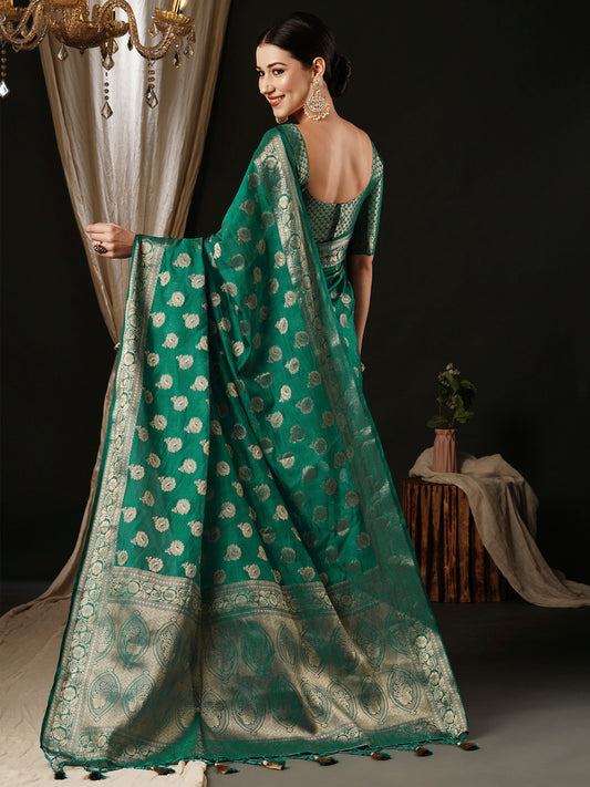 Women's Silk Blend Sea Green Embellished Designer Saree With Blouse Piece