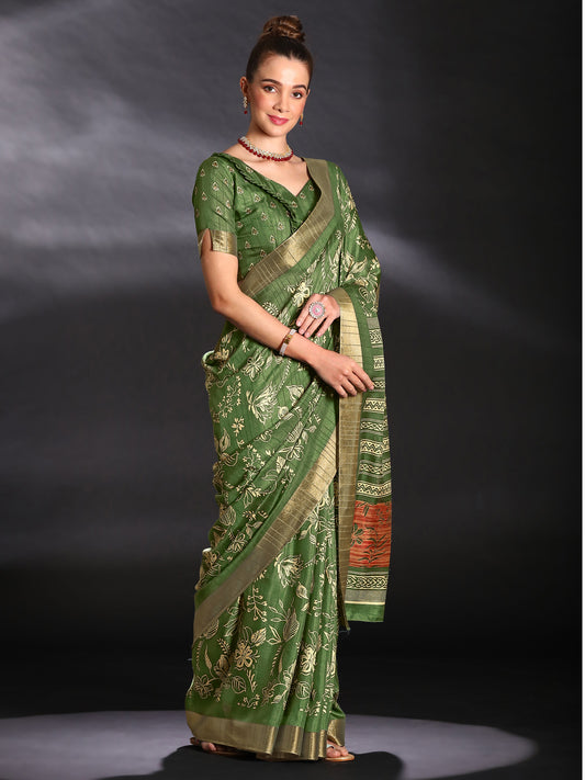 Women's Silk Blend Olive Printed Designer Saree With Blouse Piece