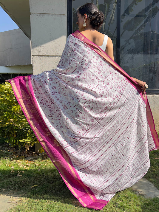 Women's Dola Silk White Printed Ready to Wear With Blouse Piece