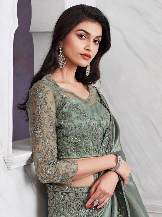 Women's Chiffon Sea Green Embellished Designer Saree With Blouse Piece