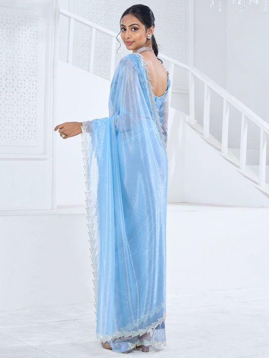 Women's Organza Light Blue Embellished Designer Saree With Blouse Piece