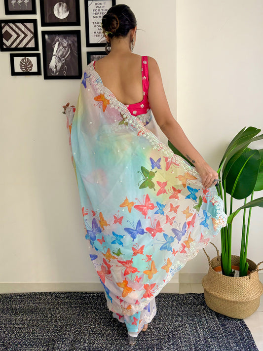 Women's Satin Silk Multicolored Printed Designer Saree With Blouse Piece