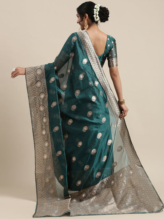 Women's Silk Blend Teal green Woven Design Designer Saree With Blouse Piece