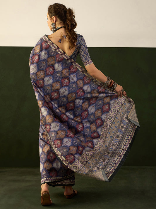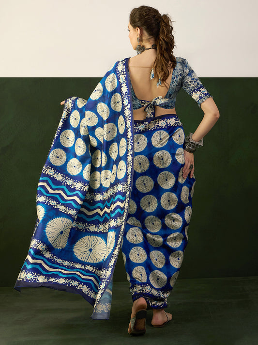 Women's Bhagalpuri Silk Blue Printed Designer Saree With Blouse Piece