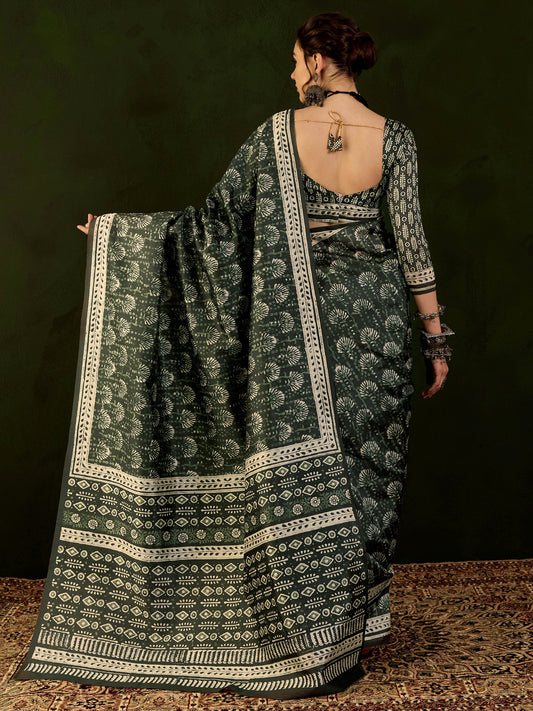 Women's Cotton Linen Green Printed Designer Saree With Blouse Piece
