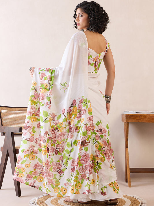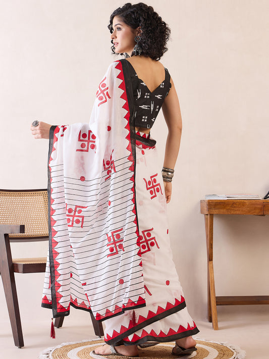 Women's Cotton White Printed Designer Saree With Blouse Piece