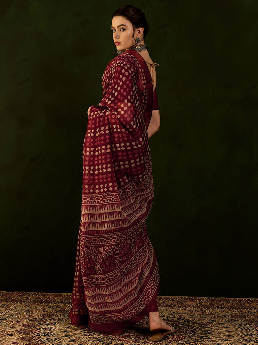 Women's Cotton Linen Maroon Printed Designer Saree With Blouse Piece