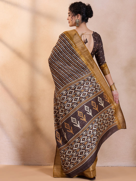 Women's Silk Blend Brown Printed Designer Saree With Blouse Piece