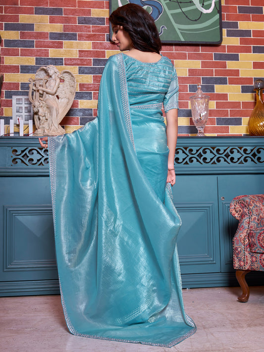 Women's Organza Light Blue Embellished Designer Saree With Blouse Piece