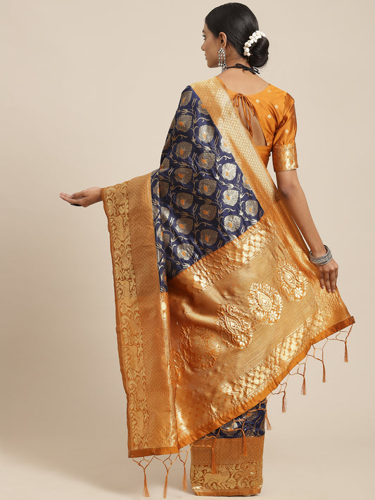 Women's Silk Blend Navy Blue Woven Design Woven saree With Blouse Piece
