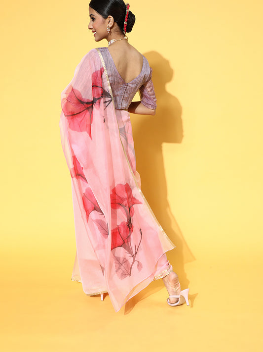 Women's Organza Pink Printed Celebrity Saree With Blouse Piece
