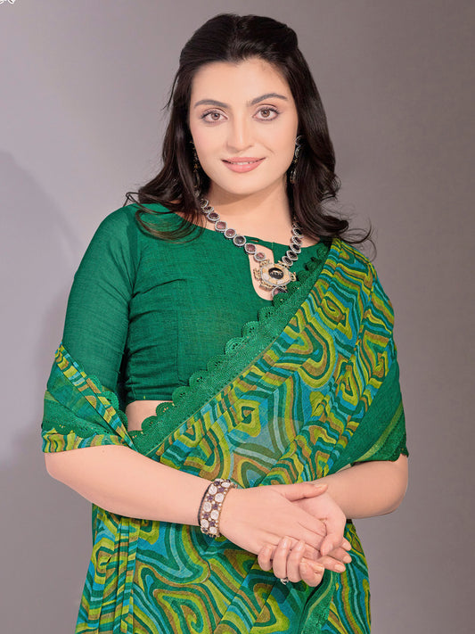 Women's Chiffon Green Printed Designer Saree With Blouse Piece