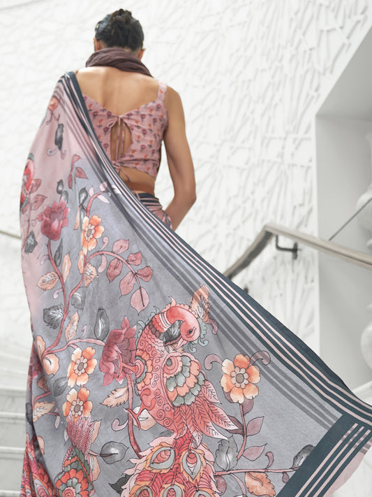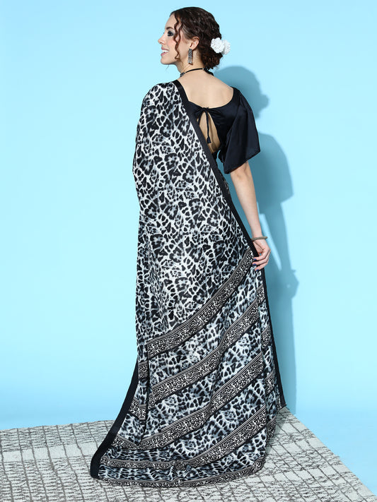 Women's Crepe Grey Printed Celebrity Saree With Blouse Piece