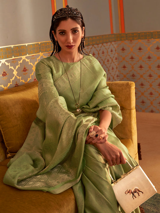Women's Organza Olive Woven Design Handloom Saree With Blouse Piece