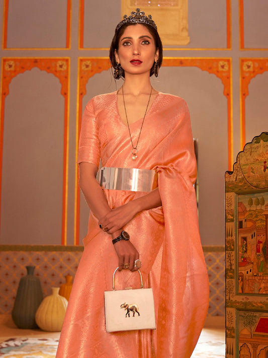 Women's Organza Peach Woven Design Handloom Saree With Blouse Piece