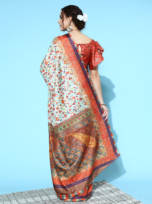 Women's Crepe Off White Digital Print Designer Saree With Blouse Piece