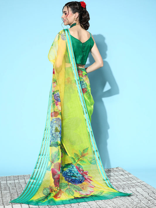 Women's Organza Green Printed Designer Saree With Blouse Piece