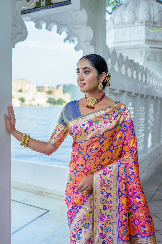 Women Paithani Aarti Orange Saree With Unstiched Blouse