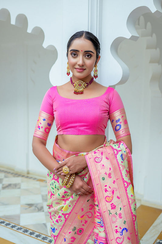 Women Paithani Aarti Pista Saree With Unstiched Blouse